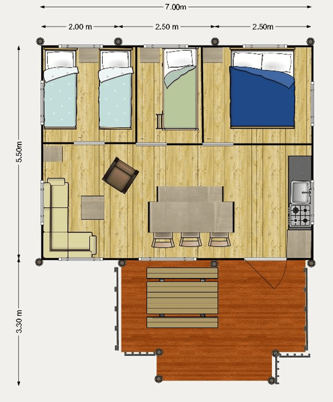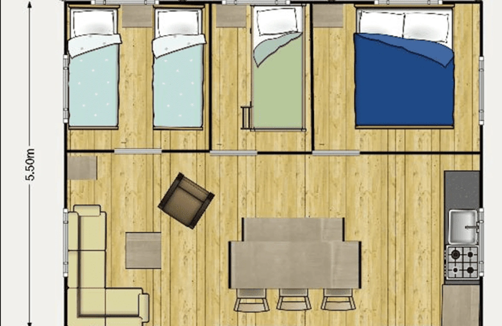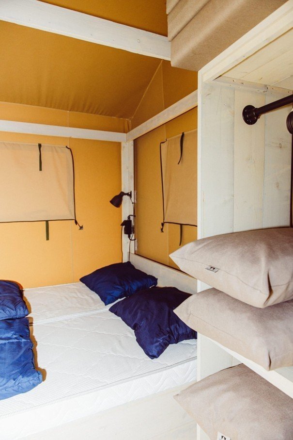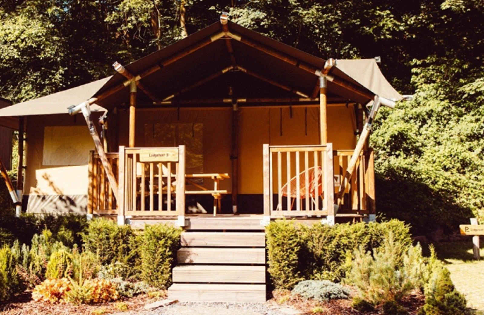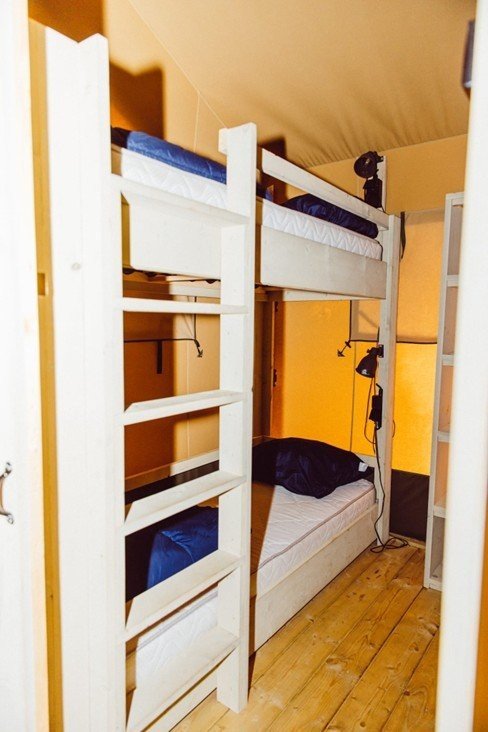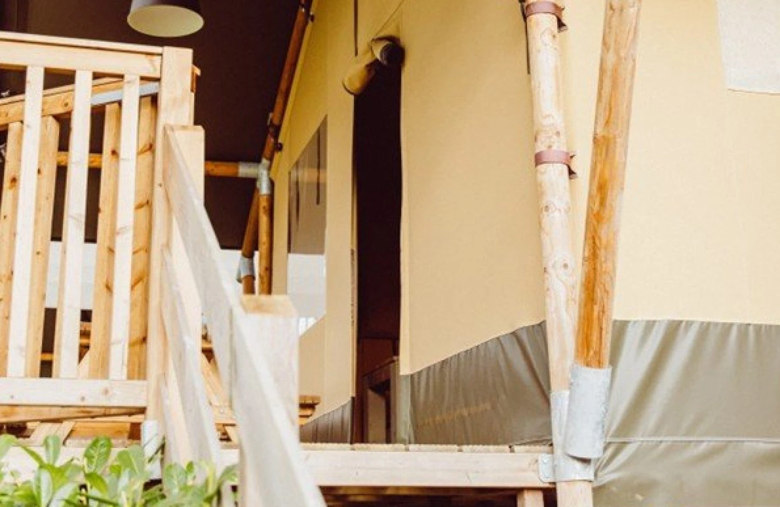 De tent is volledig ingericht met comfortabele bedden, een gezellige zithoek en een praktische keukenhoek. Geniet van het buitenleven op het privéterras, terwijl de kinderen veilig kunnen spelen in de omliggende natuur.