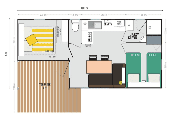 Mobilehome Sideschlee is een gezellig chalet voor vier personen, gelegen langs het water aan de camping. Met een privéterras kun je hier heerlijk ontspannen en genieten van het stromende water en de groene omgeving.