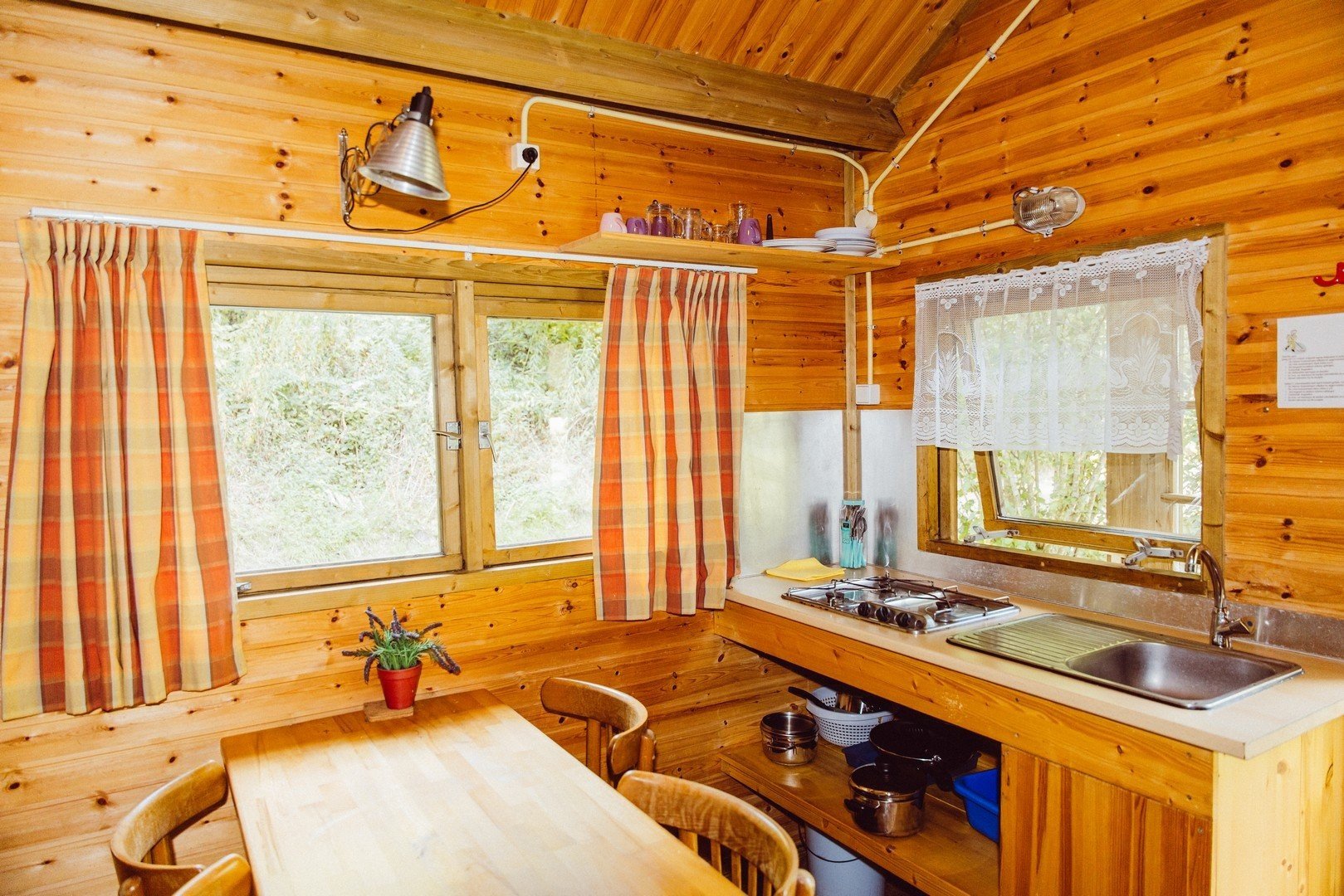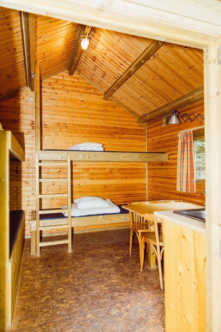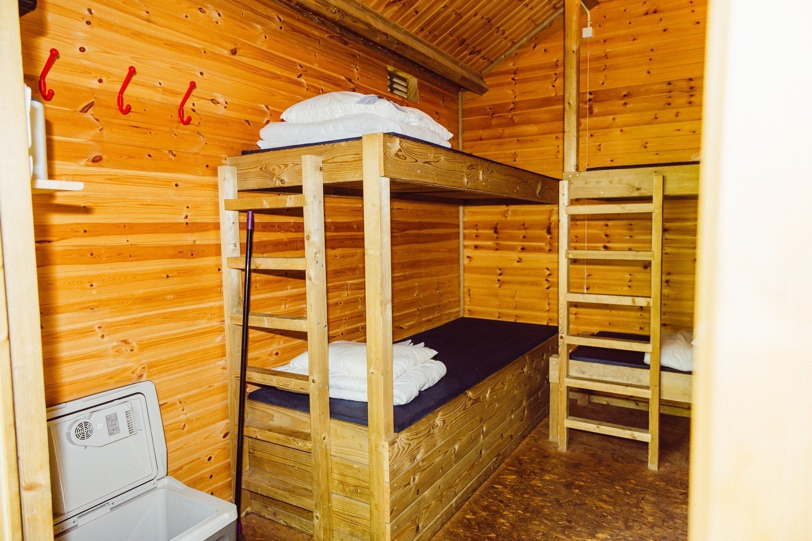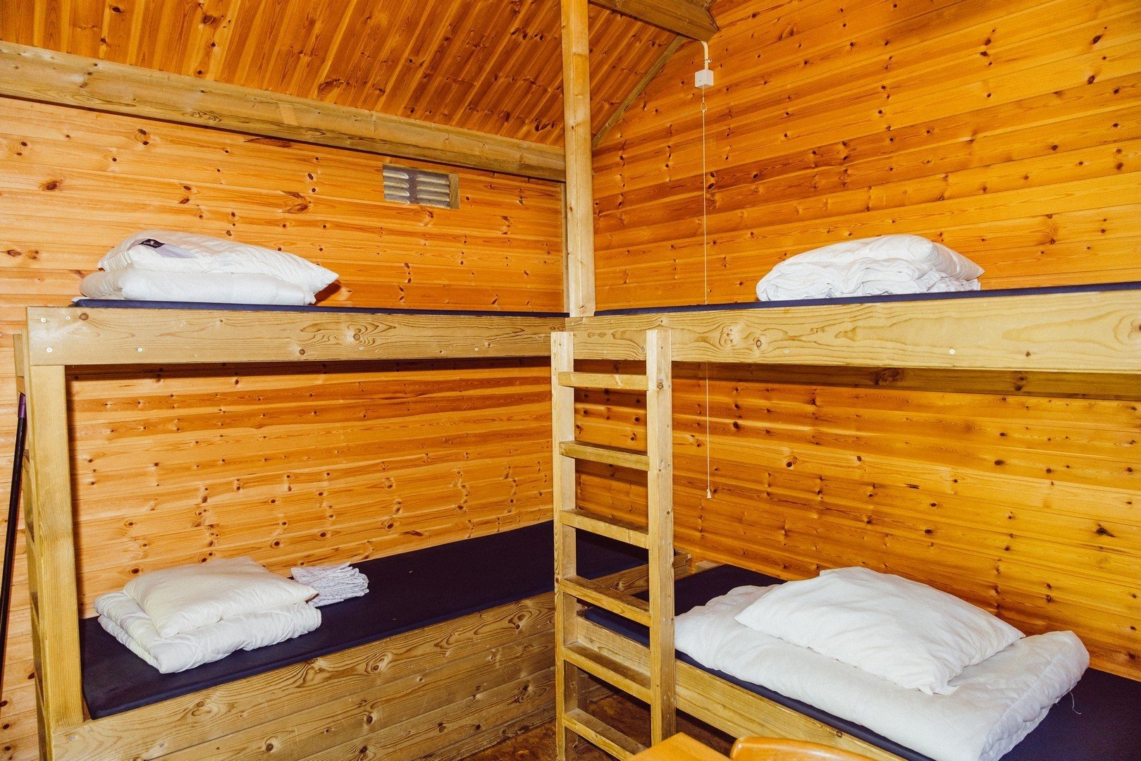 Onze trekkershutten bieden een eenvoudige, knusse overnachtingsplek voor vier personen. Met twee stapelbedden en een klein keukenblokje is alles aanwezig voor een praktisch verblijf.