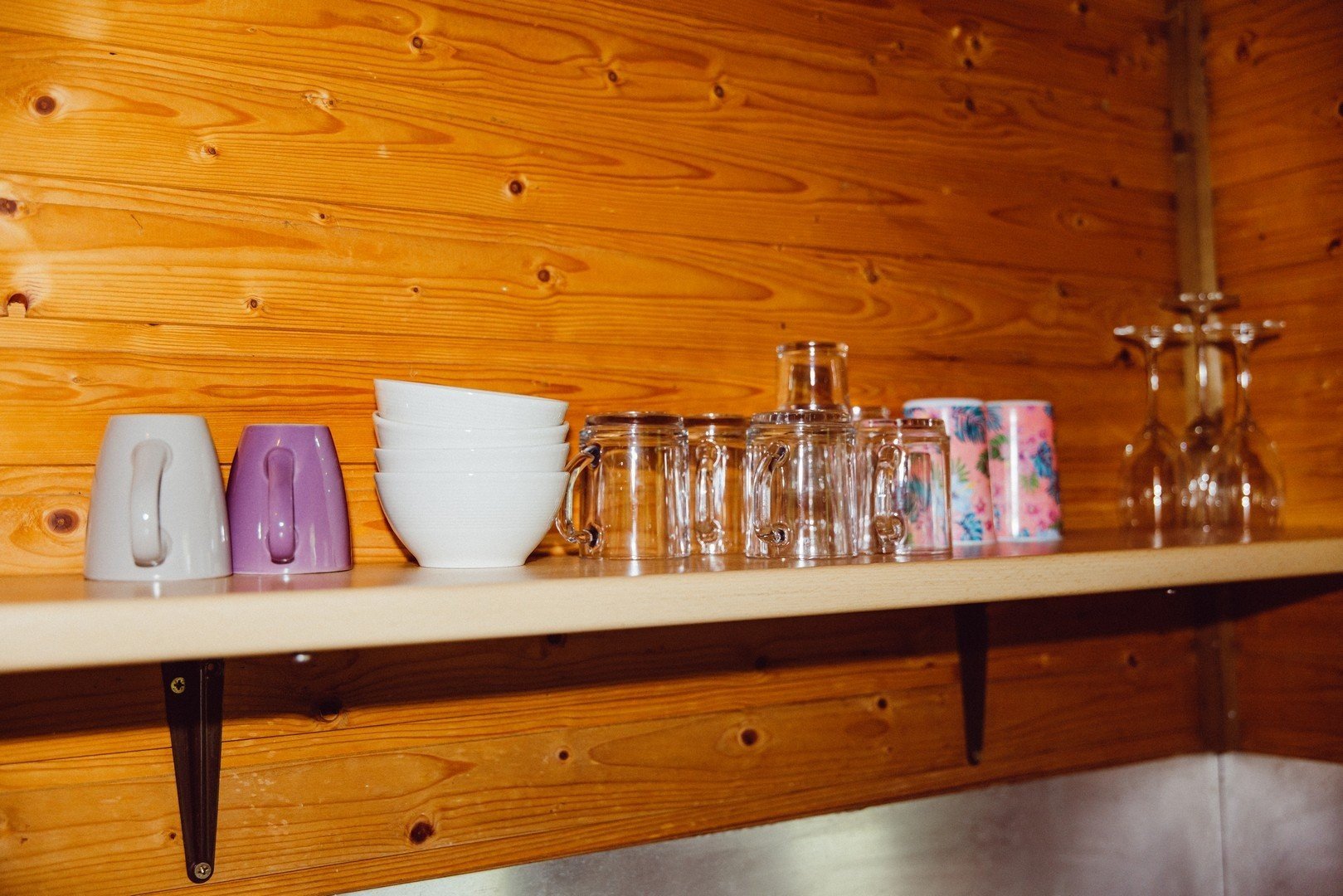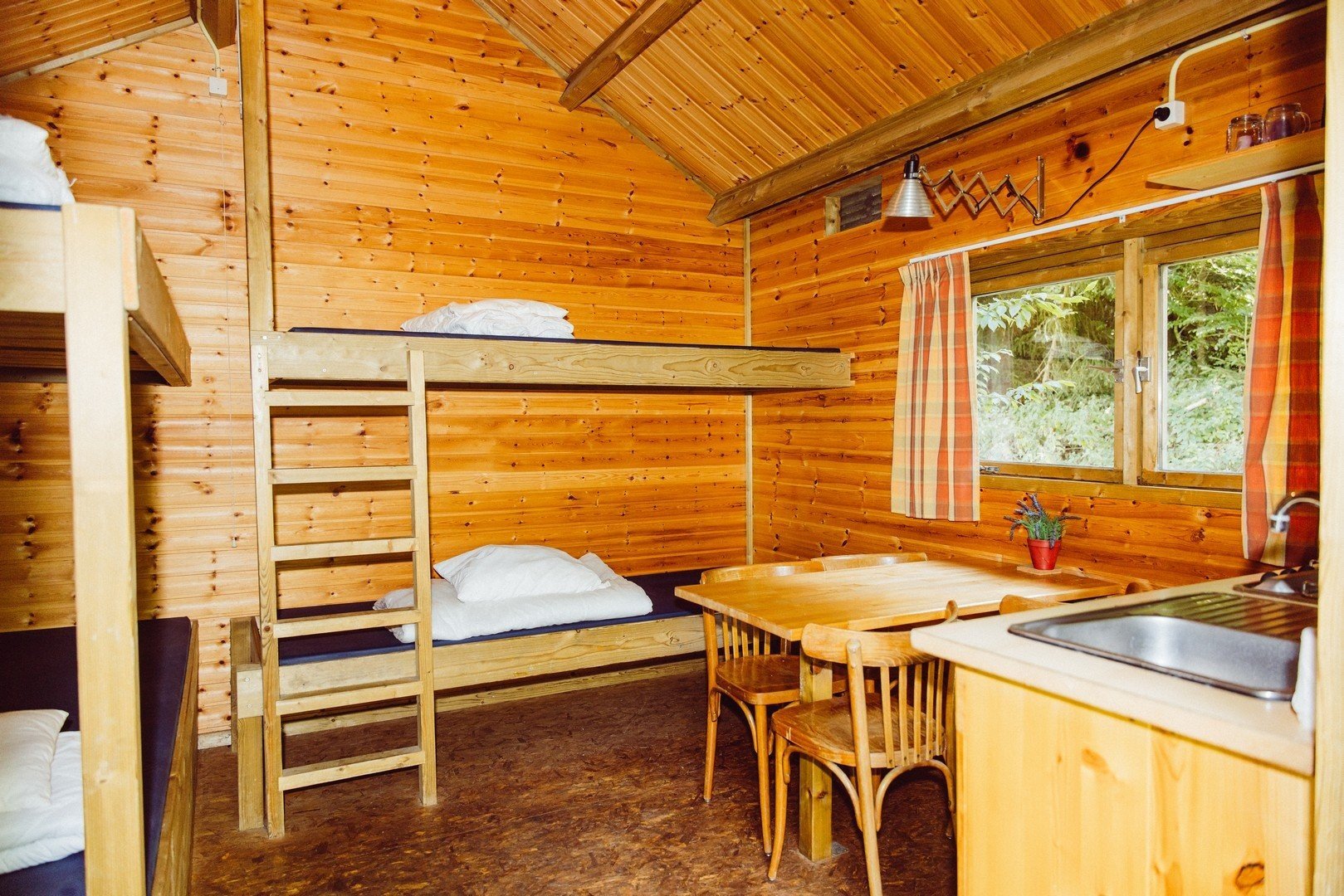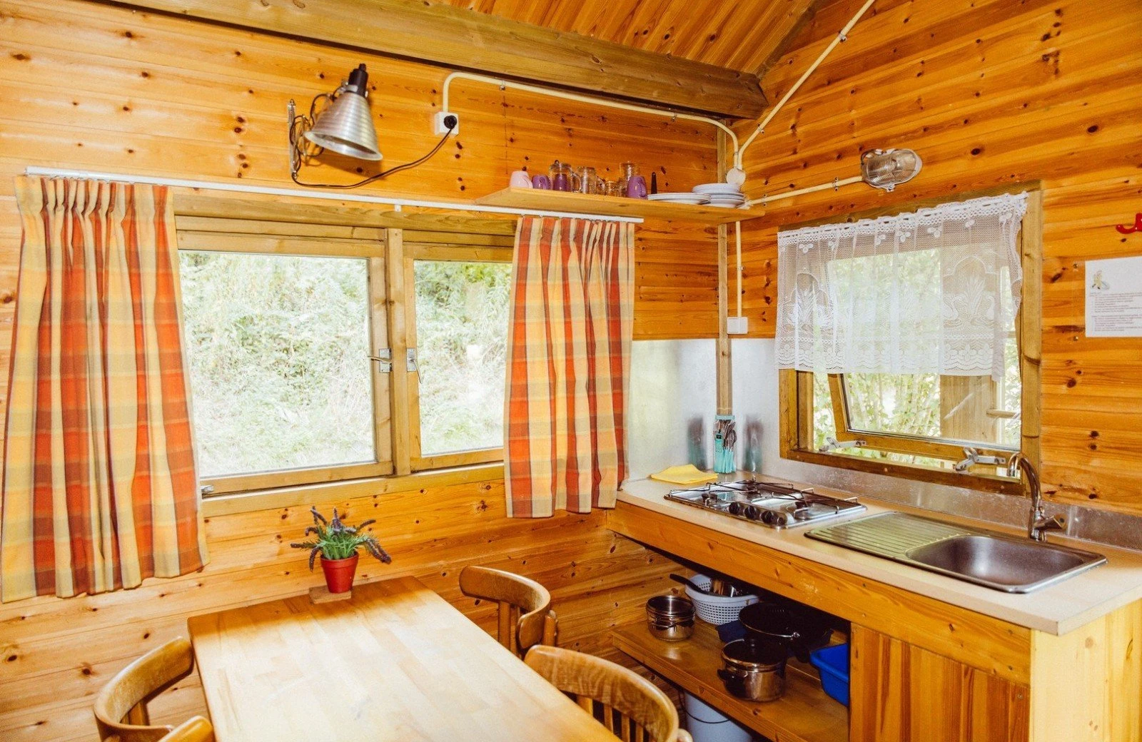Onze trekkershutten bieden een eenvoudige, knusse overnachtingsplek voor vier personen. Met twee stapelbedden en een klein keukenblokje is alles aanwezig voor een praktisch verblijf.
